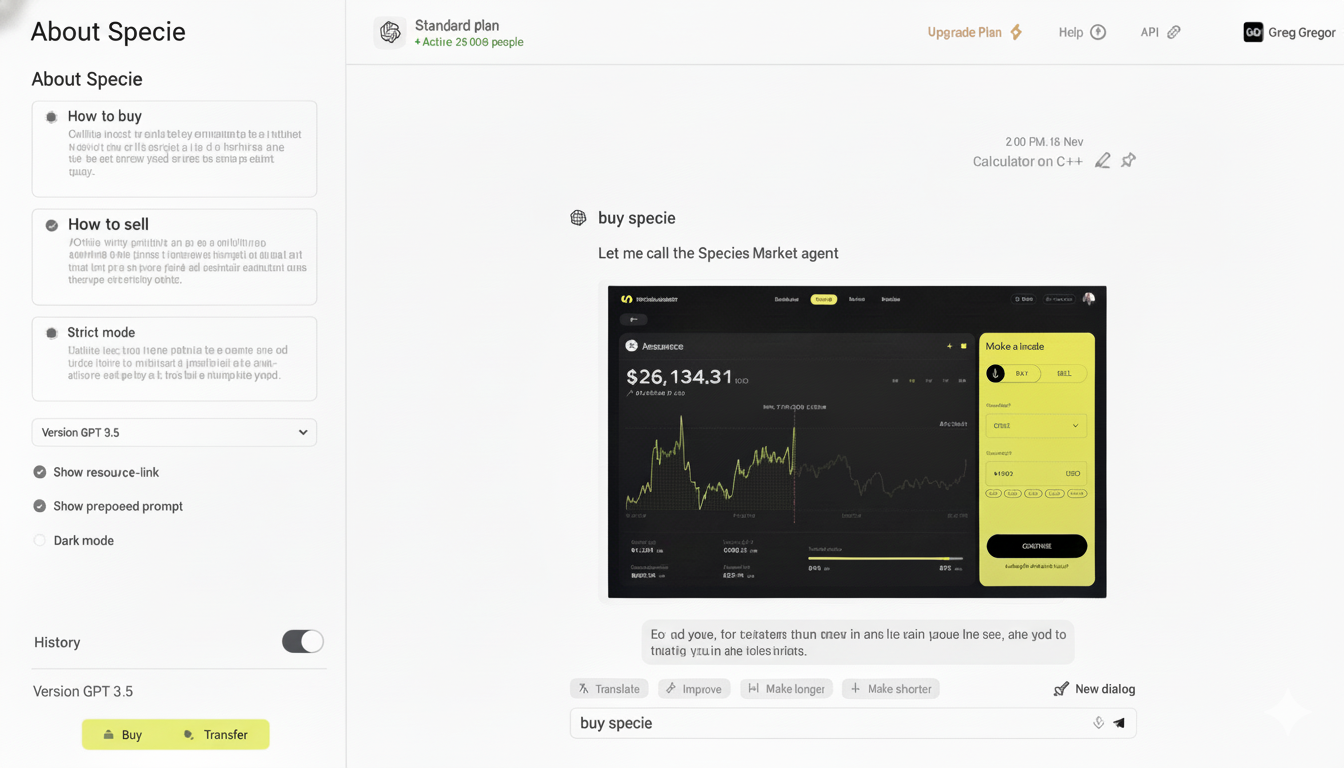 Acquire Species™, your first micro-commodity, directly through Species.Market. No complex interface — simply speak or type your intent: "Buy Species," "Send Species to Paul," "Sell Species," "Use Species to pay." English is your trading language. Finance without friction. Species is an intelligent asset, accessible through any AI agent connected via the SPEC MCP. Trade in a new Species of economy.